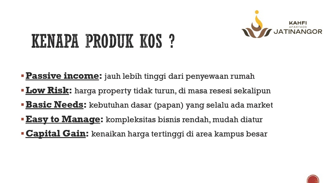 Tidak hanya untuk tempat tinggal, Kahfi Apartkos Jatinangor Bandung juga merupakan peluang investasi properti yang menjanjikan di kawasan pendidikan berkembang. Ini bukan sekadar proyek baru, tapi peluang emas investasi properti kos di kawasan yang setiap tahunnya dipenuhi ribuan mahasiswa dari berbagai daerah.